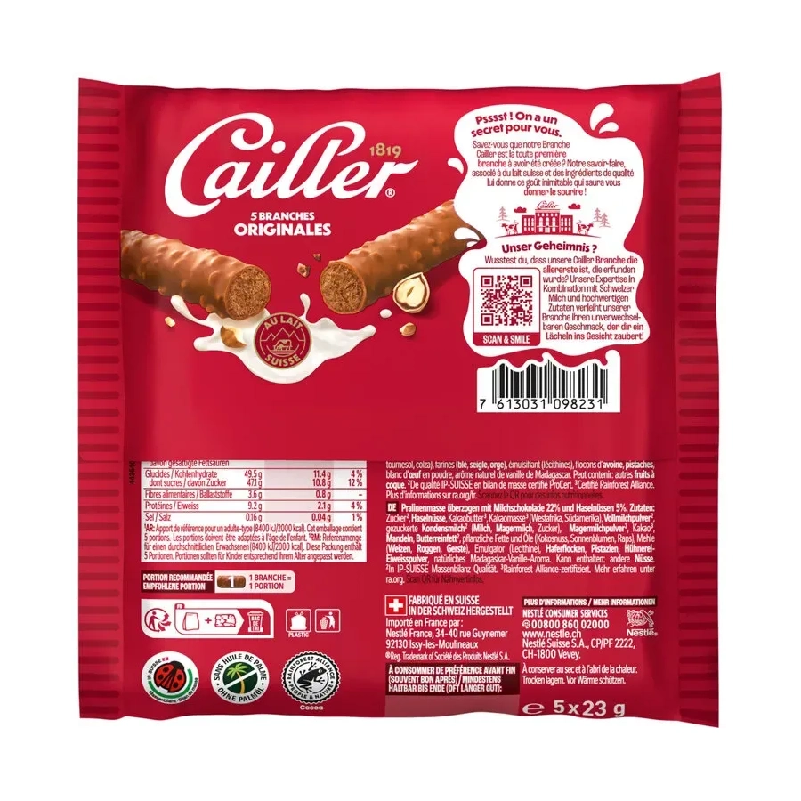 • Compromiso con la sostenibilidad: Cailler se dedica a abastecerse de granos de cacao a través del Nestlé Cocoa Plan, que apoya a los agricultores y trabaja para crear una cadena de suministro de cacao más sostenible.