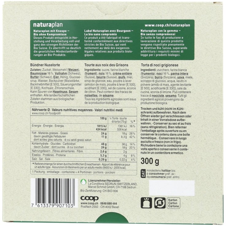 A Torta Orgânica de Nozes de Grisons Naturaplan é perfeita para qualquer ocasião - seja para um jantar, para um momento de tranquilidade com um café ou para presentear alguém especial com um gostinho da Suíça. Sua doçura de nozes e a crosta em flocos tornam cada mordida inesquecível.